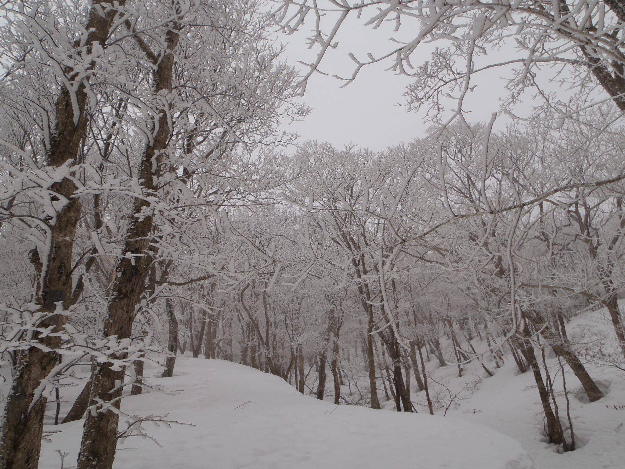 霧氷に覆われたブナ林、美しいです。ここの激下りは、シャクナゲがたくさん自生するところですか。