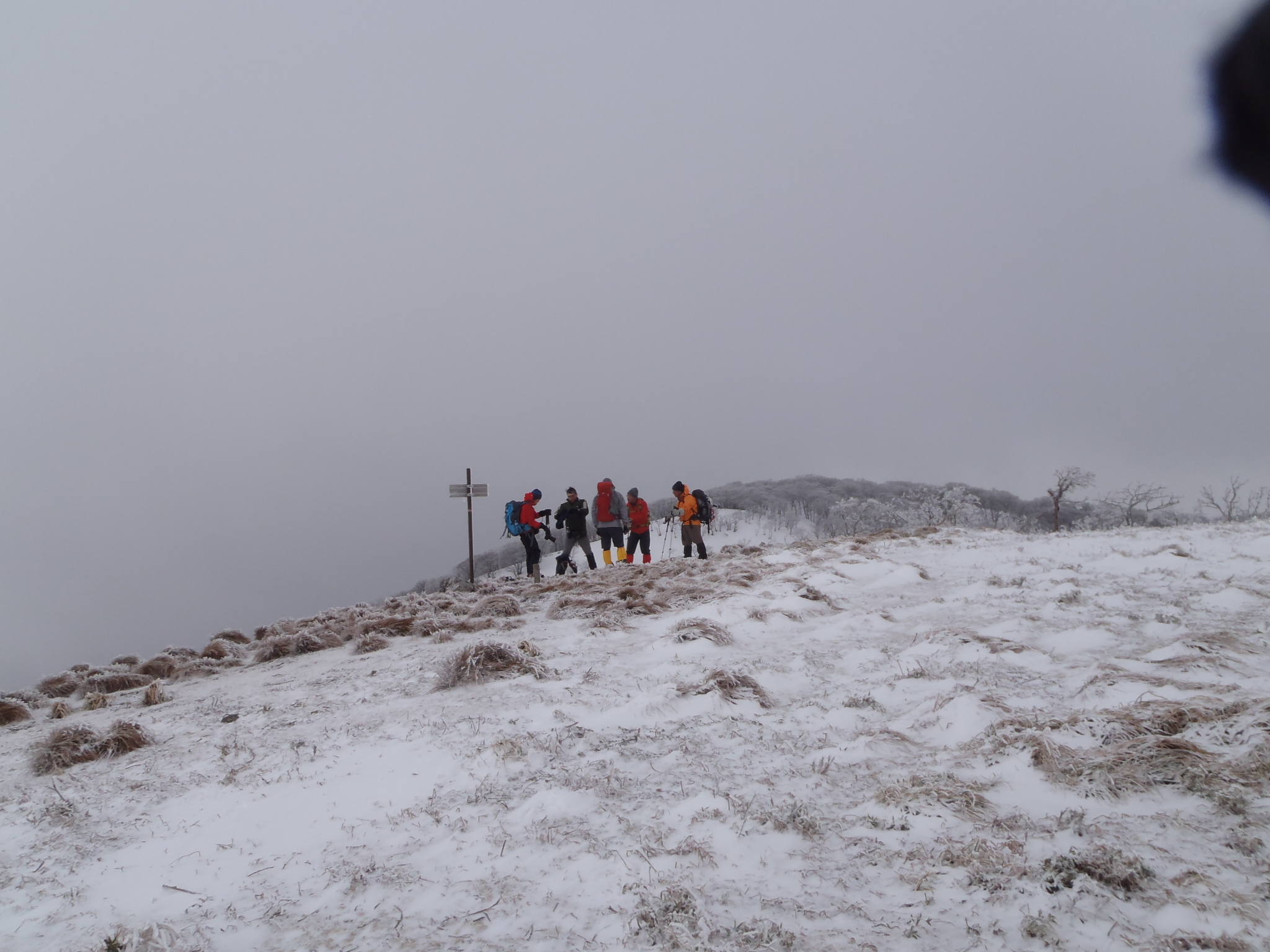 植林帯の中を4~50分くらい急な登りをこなすと尾根の上部に出た。辺りはガスっていて風もあり寒かった。
