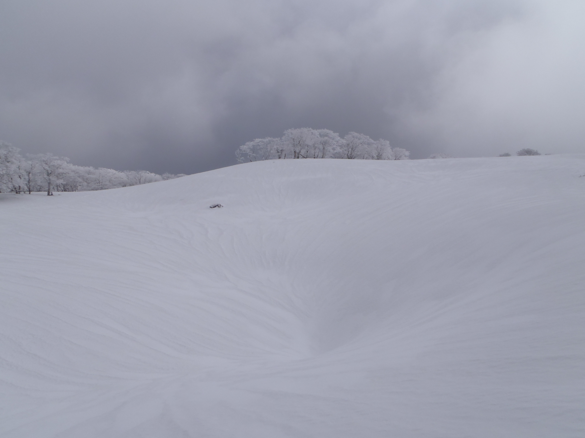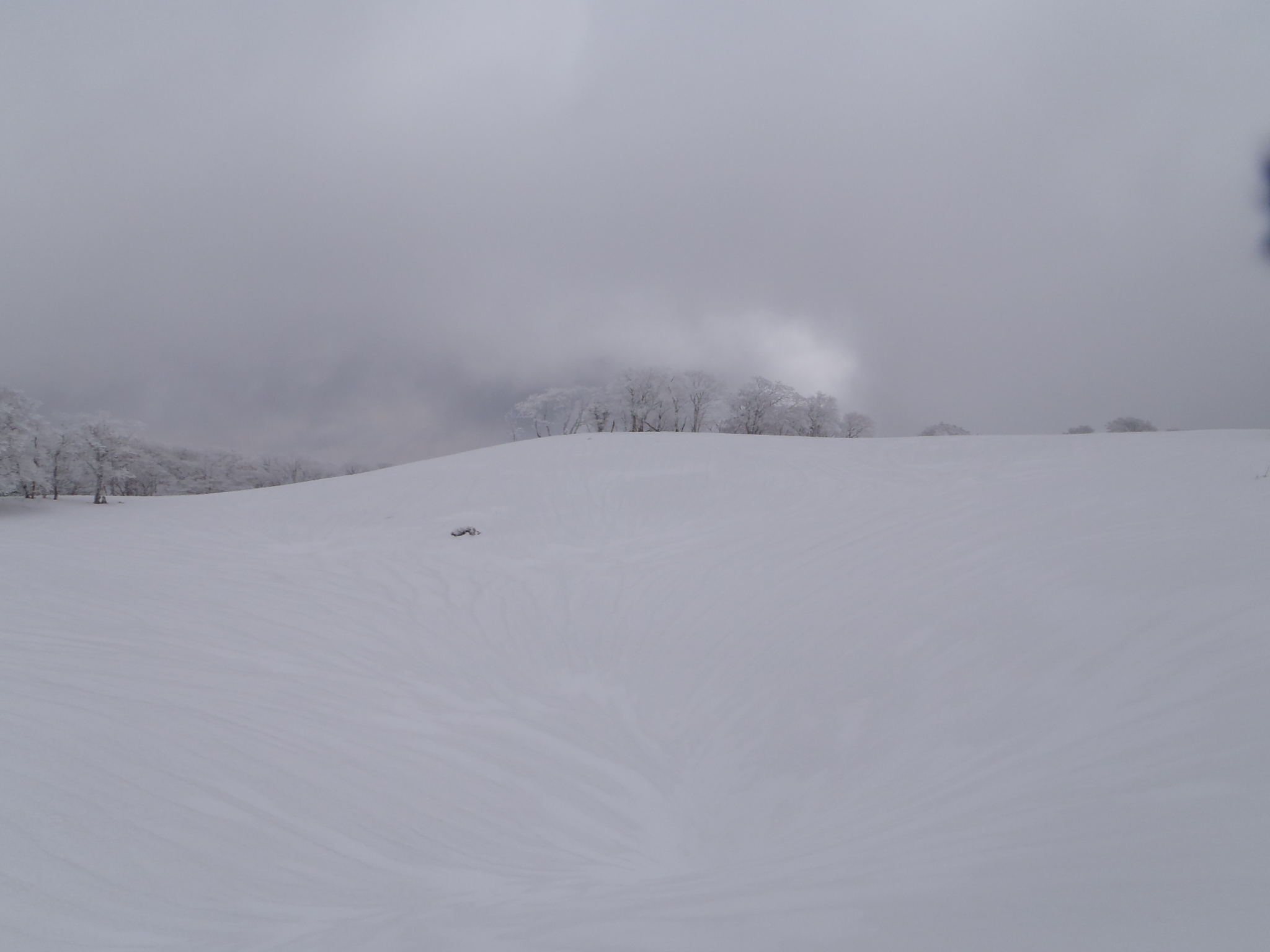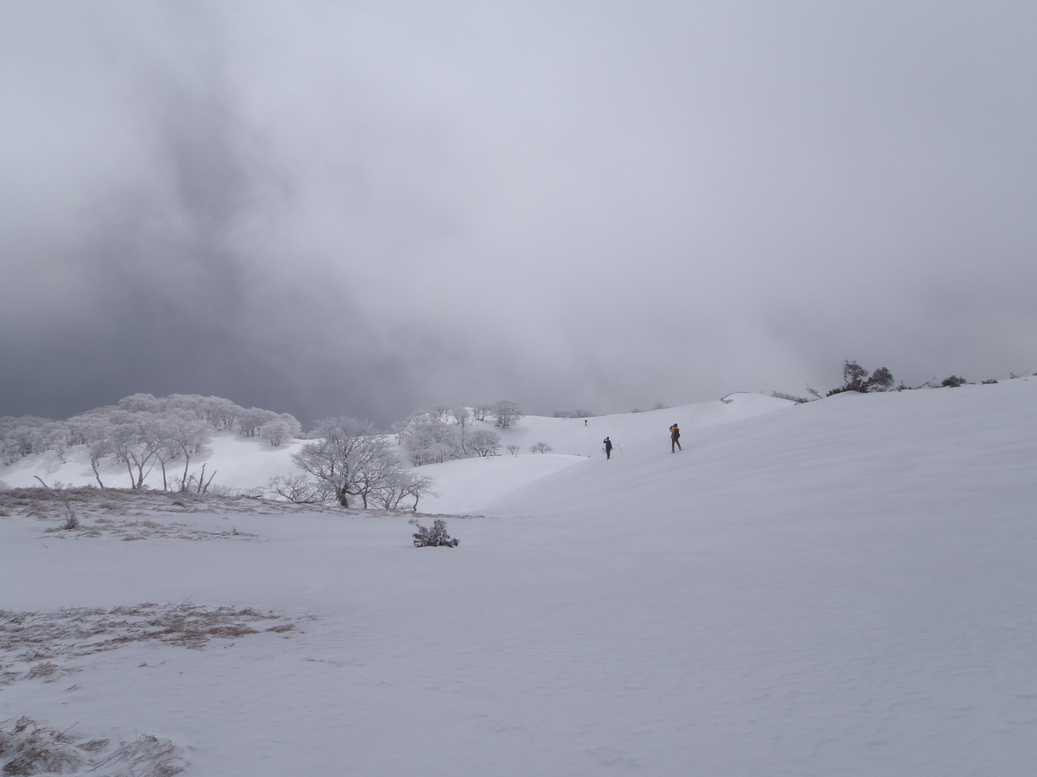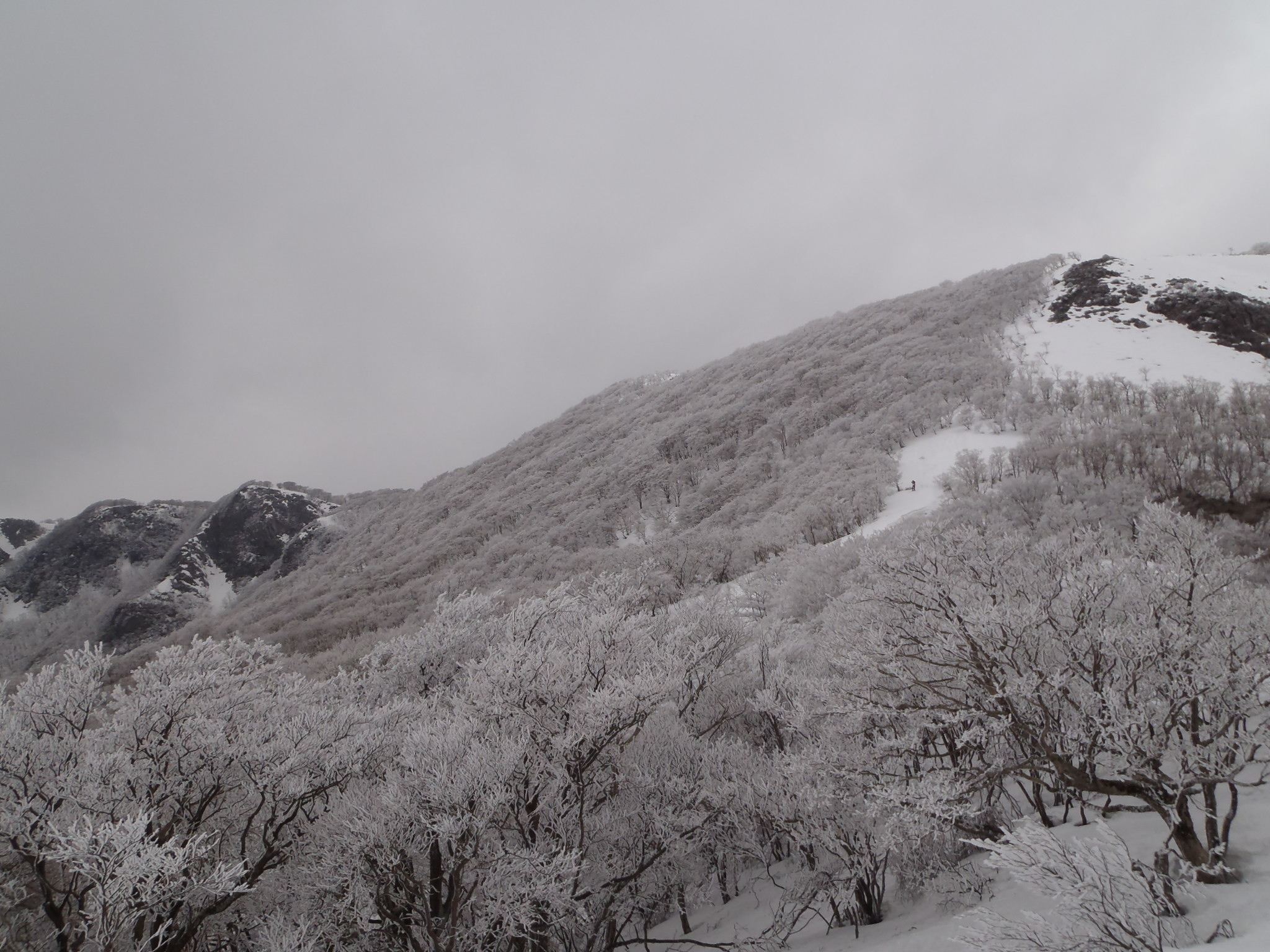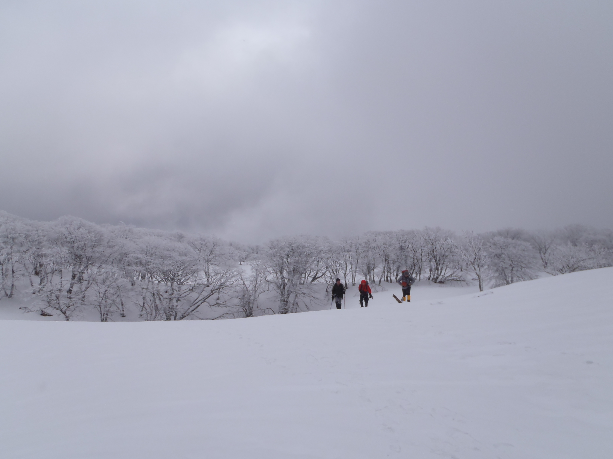 一旦下って、霧氷に覆われたブナ林を通過する。  痩せ尾根を歩き小ピークに出ると風も収まって来た。