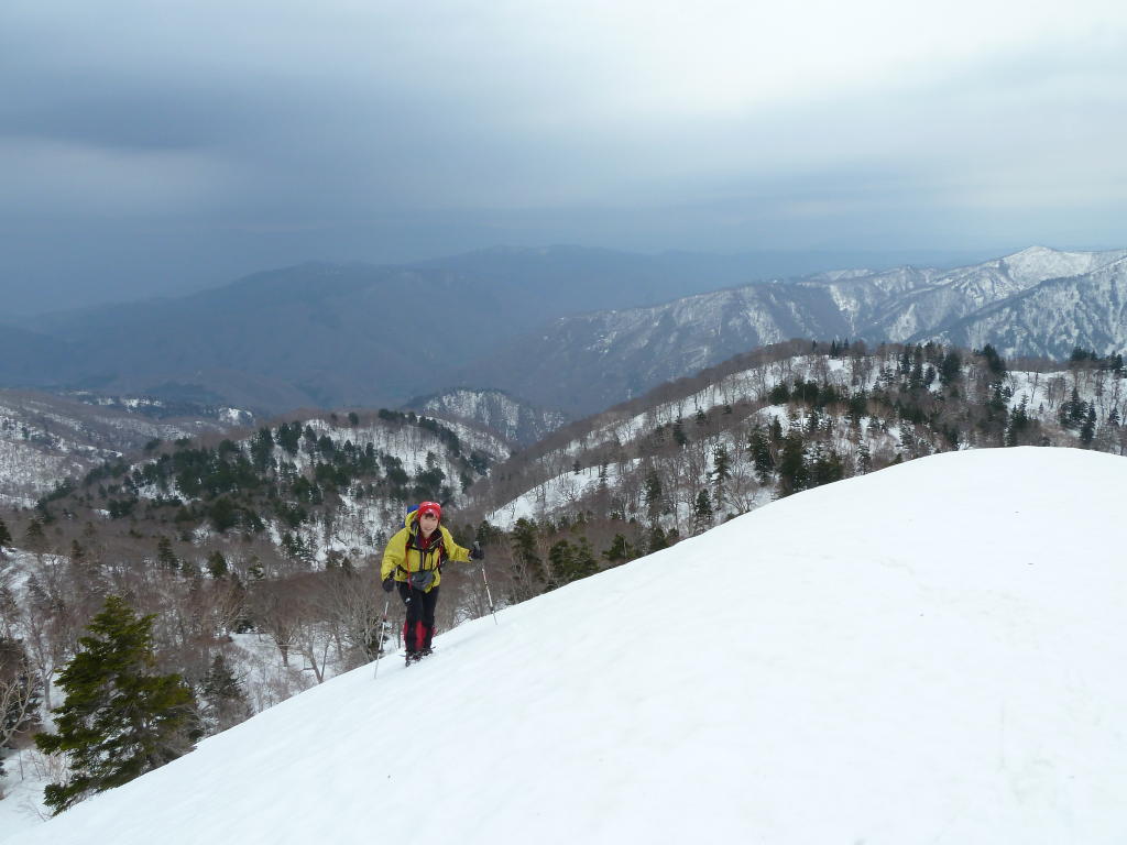 ポイントだったが、ヤブはすべて雪の下。ブナの疎林を一歩ずつアイゼンを利かせて登るだけだ。