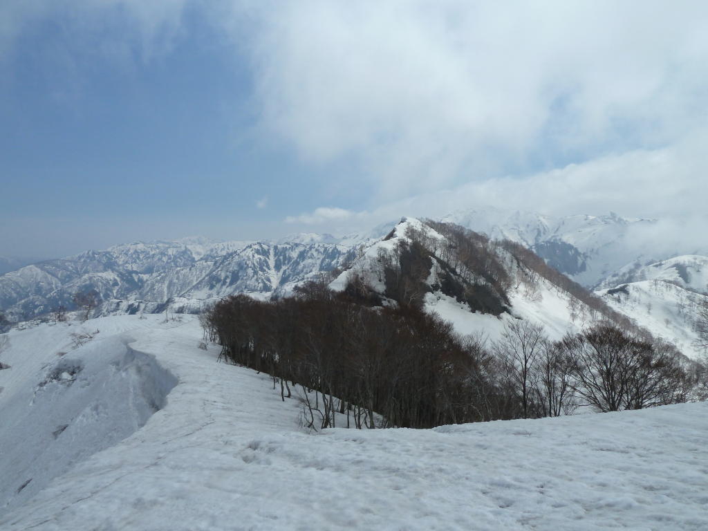 切り開きが終わってホンの少しヤブを漕げば、期待通り雪が繋がった。ブナ林が始まる1267m標高点からの急登のヤブが最大のポイントだったが、ヤブはすべて雪の下。ブナの疎林を一歩ずつアイゼンを利かせて登るだけだ。前回はヤブに気を取られてあまりわからなかったが、この急斜面のブナ林もなかなかのものである。