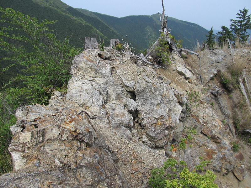 さて核心部のキレットに来た、わりばしさんは難なく通過したので、ビビッタなんて書けやしない、スイスイと通ろうかと進むが以前より崩壊は進んでるよ、前は尾根の上は歩かなかった所ももうそこしか通れなくなってきている、そのうち馬乗りになって進まないといけないかも。やっぱりびびってしまったのだった