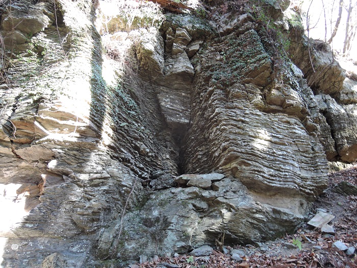 風当たりも少なさそうな祠なのになんで落ちちゃったんでしょ?祠の前面にお供えを置くテラス状の張り出しもついていたのですが、それだけが折れて(割れて)近くに落ちてました。上から落石かなんかがそれに直撃破損、勢いで祠本体が前に吹っ飛ばされコロコロリン・・・。こんな感じではと。あそこ、窪みはあるのですが、上は一部ホボノーガード。