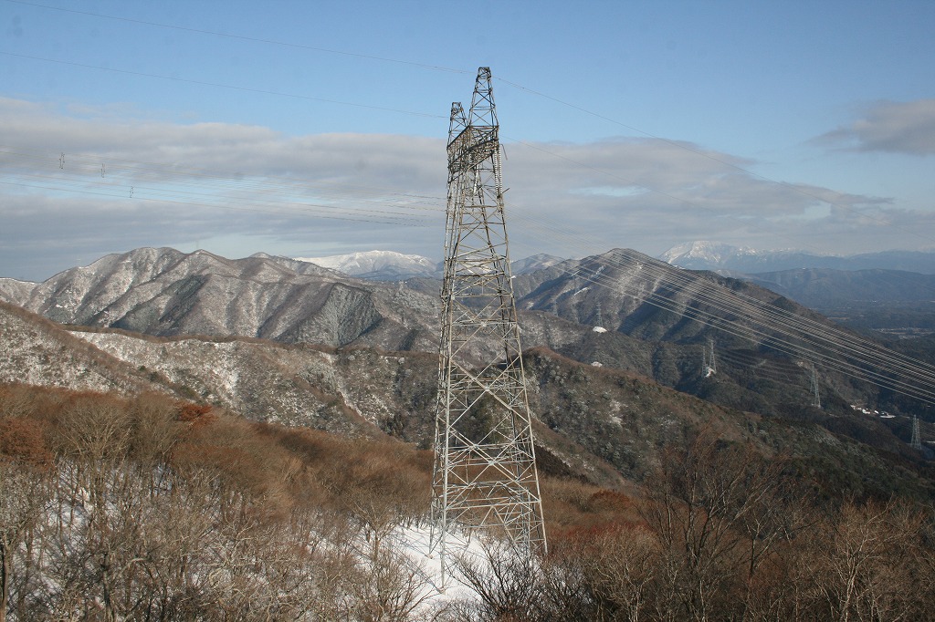 冷川林道へ入り、すぐの鉄塔巡視路に入る。よほど奥の登山道を歩こうかと思ったが、時間優先で慣れた巡視路を歩く。昨日、雪が降ったようで、1、2cm積雪していた。まだ、誰も歩いていないようで、踏み跡は無い。