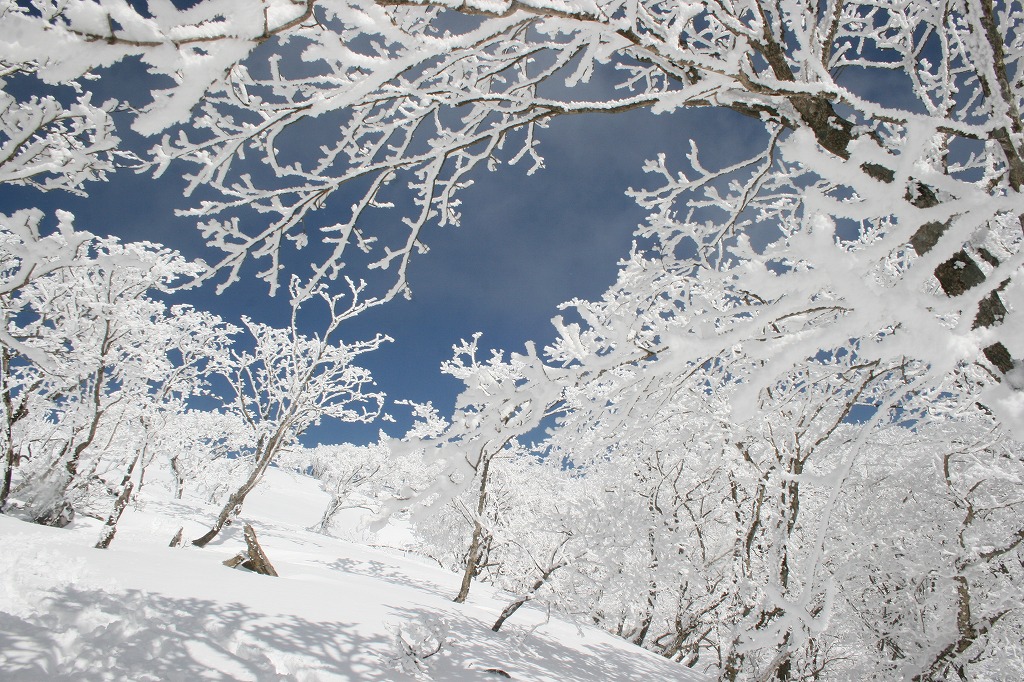 真の谷への下りは奥が谷というのですか。知りませんでした。降雪直後できれいですね。クロオ さんが書きました: 白船峠からは下り。アイゼンのまま、尾根道を下りる。真の谷も休憩せずに通過する。見上げると、木に霧氷は全く付いていない。東のボタンブチを目指しやや左方向に進む。急登だが、がまんして、一歩一歩、息を整えながら進む。日差しが暖かい。雪は適度に硬くて踏み抜くことは無いのだが、もうそろそろ、くさりそうだ。