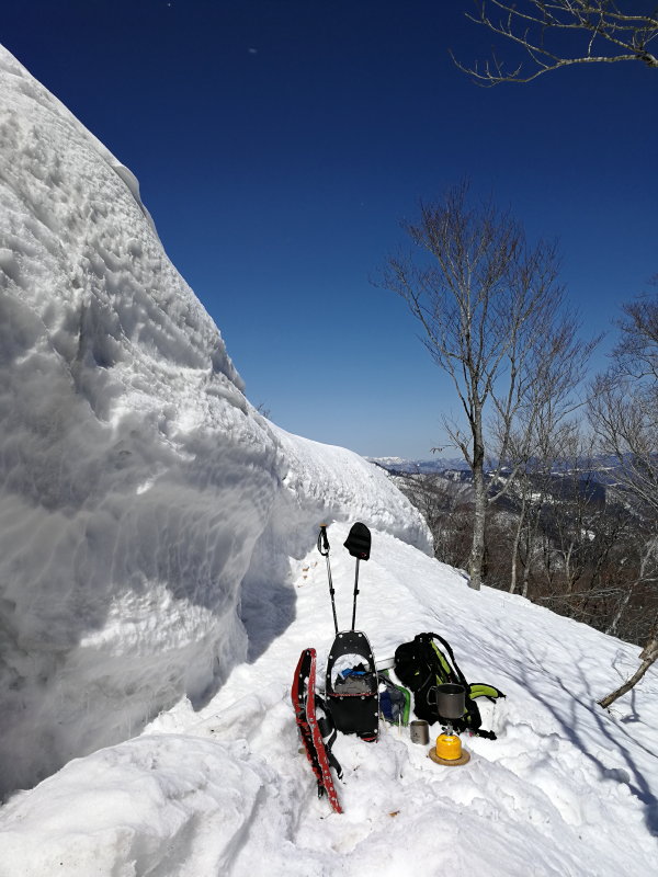 少し風があるのでここに腰を降ろすわけにはいかない。東側にできた3mほどもある雪堤の下で店を広げ