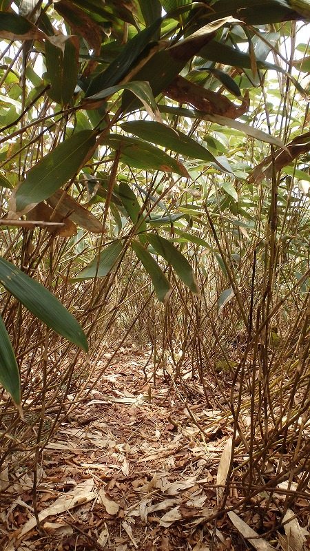 立ち上がって向かったのは北に伸びる尾根。頭の先より背の高いササのトンネルのような踏み分け道を歩いている。