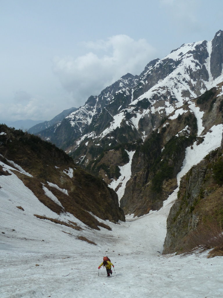 本流へのトラバース地点も迷うことなく見付け、難なく大滝上流の雪渓とほとんど段差のない小尾根に乗った。