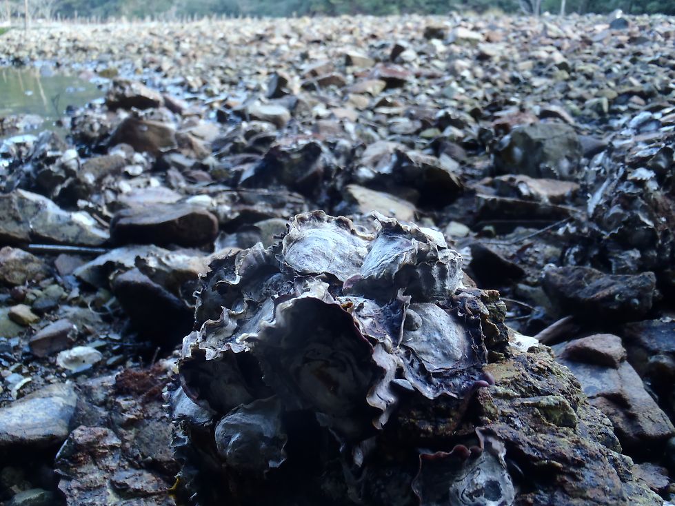 お土産にカキをたたいて石から外す。ふたが割れてしまったのはグーがペロリ生食。
