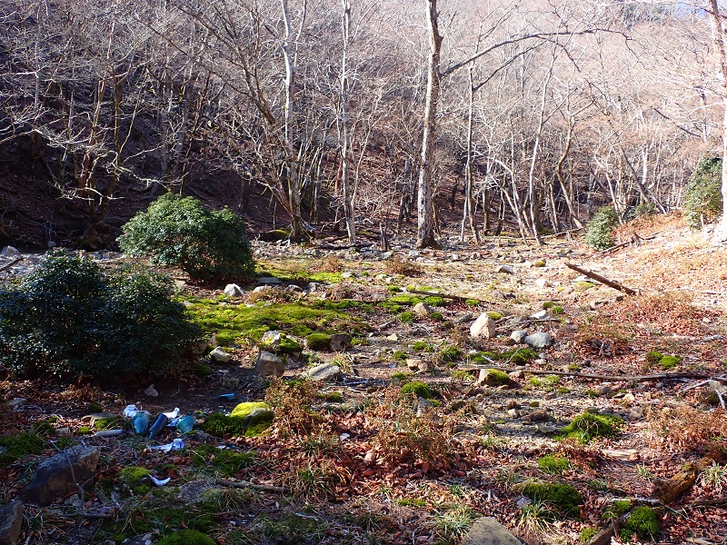 これに沿って下っていくと六線索道跡に着く。強固な石垣に守られた平地にレンガやわずかな生活痕が残っている。右俣にはいくつも溝道があり、木馬道跡のようで木材搬出でにぎわった残り香が感じられる。